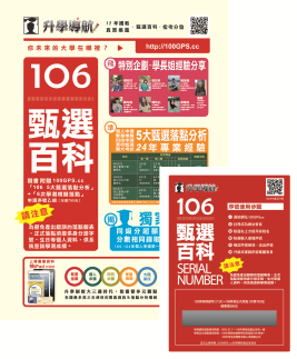 • 另贈「106甄選百科序號卡」,除可依學校成績做六次模擬落點觀看個人申請、繁星推薦、四技申請、軍校甄選以及警大考試等五大甄選報表外,還可以在拿到學測成績後做一次正式的免費落點,讓您清楚地知道自己能錄取哪所大學。