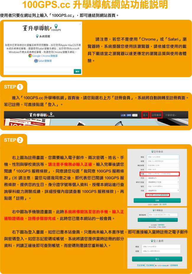 100GPS.cc升學導航網系列服務以考生、家長為中心,服務臺灣K-12學子升學相關需求,包含十二年國教、甄選入學、考試入學分發三大升學制度,以及基測、會考、學測與指考目前能應用之所有升學管道。