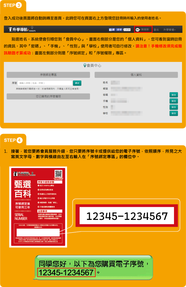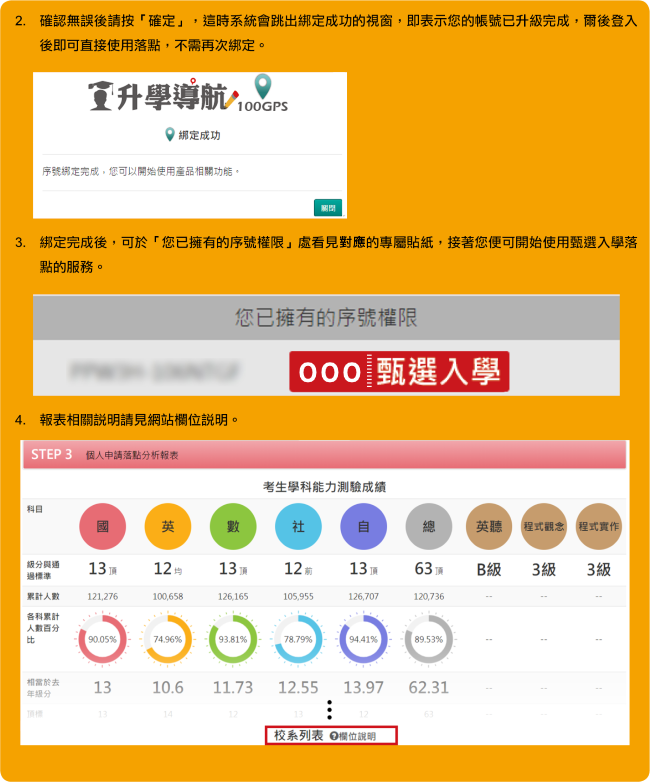 • 本序號可升級為升學導航網站(http://100GPS.cc)乙組會員權限,學生可至網站輸入學校模擬考成績,即可依自己喜好點選個人申請、繁星推薦、四技申請、軍校甄選以及警大考試等五大甄選,觀看其模擬落點分析報表,甚至可在114年學測結束官方公布答案後,利用預測的學測成績先行預估自己的落點。