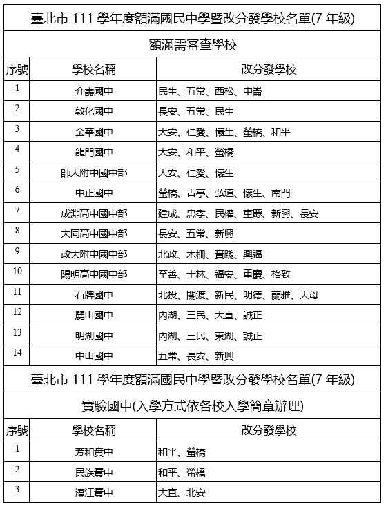 臺北市111學年入學國一額滿國中暨改分發學校名單