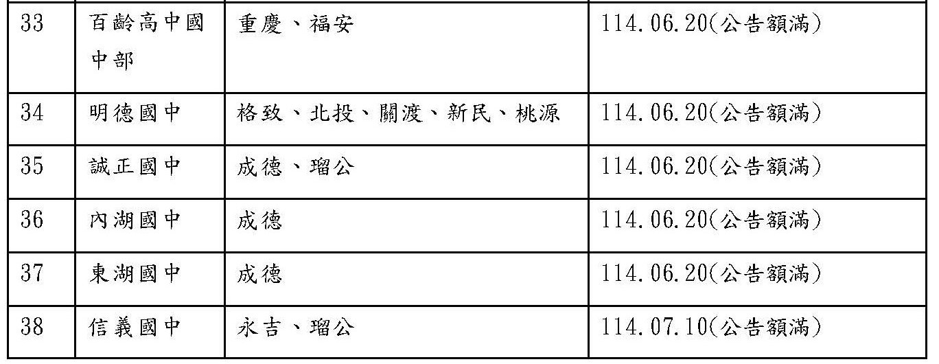 114學年臺北市公立額滿國中7年級國一入學生暨改分發學校名單