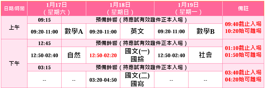 考試時間:國綜、國寫節次各90分鐘;英文、數學A、數學B考科各100分鐘;社會、自然考科各110分鐘