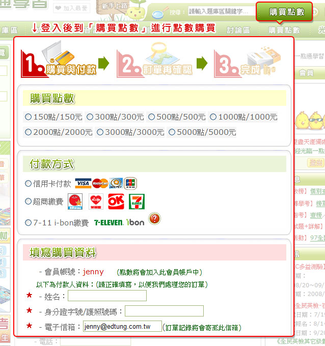步驟2:填寫相關資料(購買點數/付款方式/購買資料)後,點選「下一步」。